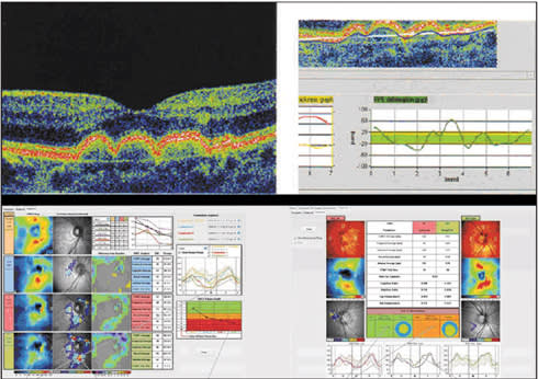 The SOCT Copernicus (Optopol, Zawiercie, Poland) has a 6-µm axial resolution and scans at 25,000 A-scans per second. It has a 10-mm B-scan width and allows single or customizable six-line radial scans, as well as 3D volume cube rendering. The device incorporates a retinal tracking system, and posterior segment analysis includes retinal thickness and RPE mapping, 3D cross-section animation software, NFL thickness mapping, and optic nerve head imaging. A unique aspect of the software is “RPE deformation,” which provides subretinal analysis in patients with age-related macular degeneration–associated drusen, comparable from session to session and deviation from normative data (Figure 7). Although the company has a normative database of more than 3,000 patients for macular and RNFL analysis, it is not yet available, as it is awaiting FDA approval.