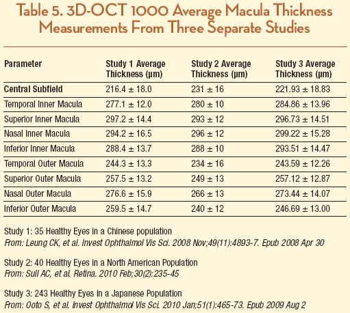 A study conducted in China that involved 35 healthy eyes comparing Stratus to 3D-OCT demonstrated better repeatability for total and regional macular thicknesses for the 3D-OCT. The authors demonstrated that the mean foveal thickness of 3D-OCT is greater than measurements taken with Stratus OCT (216.4 ±18.0 µm and 195.6 ± 17.2 µm, respectively, in 35 healthy normal subjects) and suggested that it was due to a more posterior outer reference boundary. Curiously, average total macular thickness measurements were similar: 263.2 ± 12.6 µm with 3D-OCT and 260.0 ±12.2 µm with Stratus OCT.48 The authors concluded that the SD-OCT has better measurement repeatability compared with time-domain OCT and also suggested that macular measurements obtained from theses two OCT systems may not be used interchangeably.