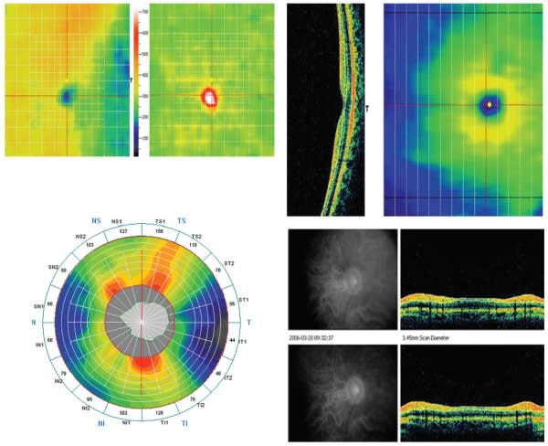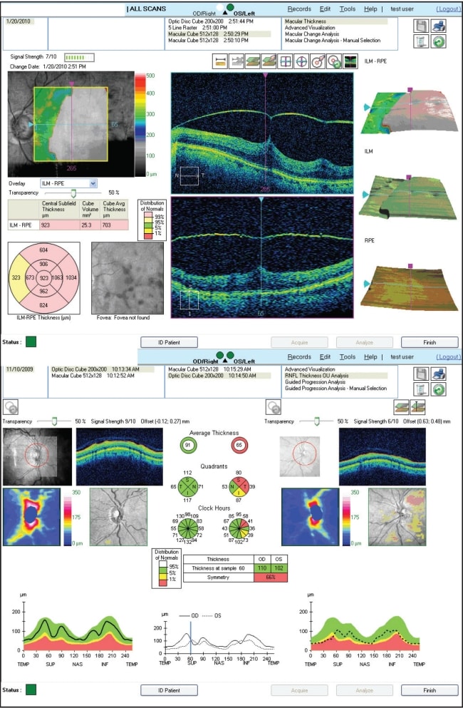 Figure 5. RTVue-100. Top two images: Macular thickness measurement and change over time. Reds and white indicate both thickness and deviation from normal, healthy thickness values. Bottom right two images: RNFL analysis, which takes into account age, ethnicity and optic disc symmetry and size based on a large normative database, in a healthy eye.