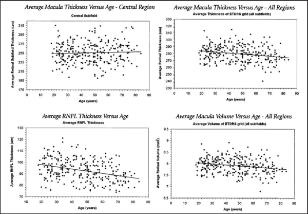 Even in healthy eyes, average RNFL thickness appears to thin with advancing age by about 2.0 to 2.3 µm per decade.10,15 In one of the largest, multicenter, multiethnic studies, of 328 healthy eyes, mean RNFL thickness for the entire population was found to be 100.1 ± 11.6 µm.