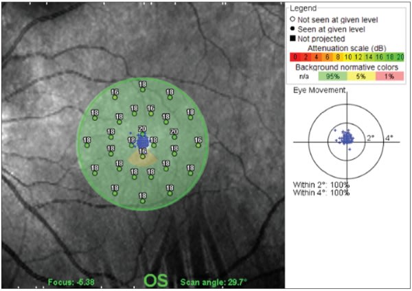 The overall mean for retinal sensitivity at all points was 18.09 db (scale range, 0 to 20 db), and there was no statistically significant decline in sensitivity with increasing age in the different brackets. Also, there was no statistically significant decrease in the measured sensitivity between the three circles. Fixation for all age categories was 98% within 4° of fixation, and 91% within 2° of fixation. Test time ranged from 4 to 11.5 minutes, with the mean 5.9 minutes (Figure 6). According to Opko, microperimetry with this instrument is a reproducible and accurate way to measure macular sensitivity around central fixation.51