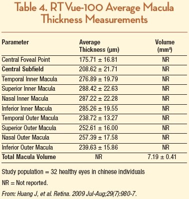 Optovue has not made their normative database publically available at this time and is currently undergoing an FDA-mandated recall of devices which use a normative database. However, several previous studies have reported data for macular and RNFL thickness in healthy eyes. Huang et al. studied 32 eyes from 32 healthy patients using Stratus TD OCT and RTVue-100 and reported the average retinal thicknesses of the nine macular sectors as defined by the ETDRS, as well as foveal center point and macular volume (Table 4). They reported that CST was 208.62 ±21.71 µm, which was significantly greater than Stratus OCT measurement by an average of 14.89 ±13.17 µm, an 8% difference.42 However, the RTVue-100 CST measurements in this study were somewhat less than in another report involving 20 healthy eyes compared between six different OCT devices, where average CST was 245 ±28 µm and 249 ±24 µm in the right and left eyes, respectively.43 Ethnic differences may have been the causative variable, as the former study was carried out in China, and people of Asian descent have thinner maculas compared with Caucasians (and the latter study was from Germany.)14,44