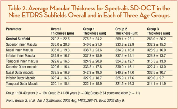 Normative macular thickness data are available for healthy patients, although there is no “official” company database. A prospective study gathering data from 50 healthy subjects, ranging in age from 20 to 84 years and of varied ethnicity, reported all ETDRS field thicknesses across three age stratifications (Table 2). Mean central sub-field thickness of all subjects was 270.2 ±22.5 µm. There were no significant differences in retinal thickness corresponding with age or gender, although the retinal thickness of Asian (279.5 ±27.4 µm) and Caucasian (272.7 ±20.8 µm) subjects tended to be thicker than that of African-American subjects (256.5 ±16.9 µm, P= .007).33