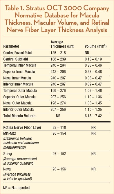 Table 1 lists average thickness measurements for all macular and RNFL zones, although not all of these are used routinely for clinical applications. Average central foveal thickness ranged from 168 to 239 µm, average macular volume ranged from 6.18 to 7.42 mm3, and average RNFL thickness ranged from 82 to 118 µm.3 These data did not include any information about pediatric populations, although normative data for macular thickness using Stratus OCT were reported in a recent study of 56 eyes of healthy children, ages 5 to 16. The authors reported that mean macular thickness was 166 ± 15 µm for the central foveal point, 204 ± 19 µm for the central macula, and 7.11 ± 0.35 mm3 for macular volume.4