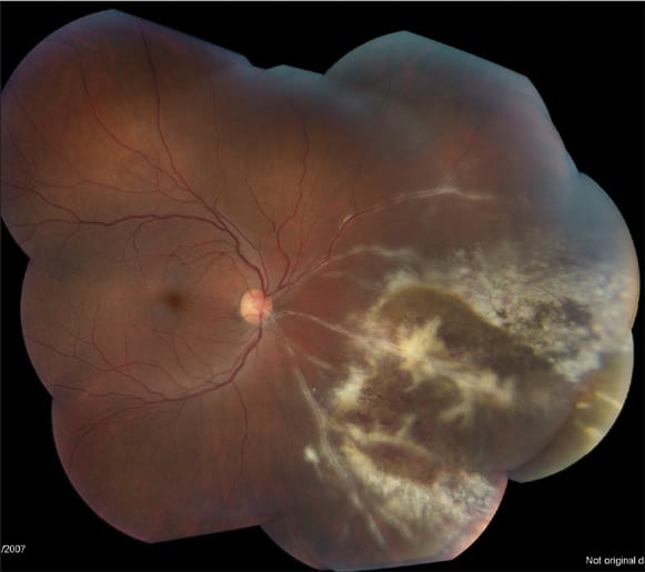 Figure 2. PORN. Note the peripheral areas of outer retinal whitening with confluent involvement of macula, and lack of vitritis or vasculitis.