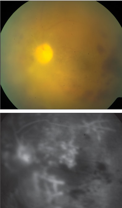 Figure 1. Characteristic appearance of ARN. Note the large areas of white retinal necrosis with overlying vitritis. FA demonstrates significant occlusive vasculopathy and neovascularization.