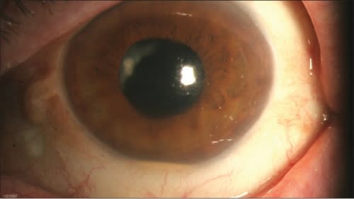 Intraocular cultures, which had previously been negative at the first vitrectomy, were positive for Aspergillus fumigatus, both from the capsular bag and from the vitrectomy specimens (Figure 3). The patient then received intravitreal amphotericin B (5μg/0.1 mL), a two-week course of oral voriconazole (200 mg bid), and was maintained on oral fluconazole (100 mg daily) for three months. Inflammation of the left eye gradually improved with this treatment. Ten months later, an anterior-chamber IOL was implanted and BCVA improved to 20/20 in the left eye (Figure 4). The fellow eye was unremarkable with 20/20 visual acuity.