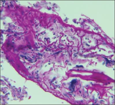 Figure 3. Special stains of the capsular bag show numerous septated fungal hyphae consistent with Aspergillus fumigatus. Cultures confirmed this organism.