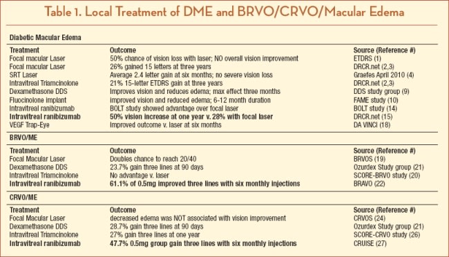 Macular edema is a well-known cause of vision loss in patients presenting with diabetic retinopathy and retinal venous occlusive disease. Given the prevalence of diabetes and hypertensive vascular disease, retina specialists are frequently confronted with the issue of formulating a treatment plan for such patients. There is no absolute algorithm regarding the approach to patient care: the retinal physician takes into account the entire clinical picture, interacts with patients and their other physicians (eg, internist, endocrinologist, cardiologist, nephrologist), and can institute local treatment based on past and recent clinical studies regarding treatment of macular edema associated with retinal vascular disease.
