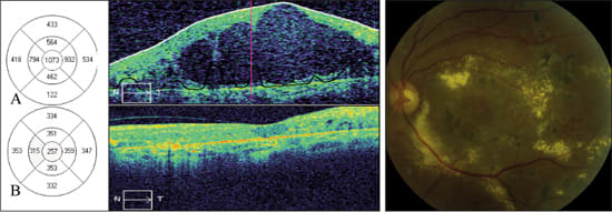 A: Horizontal scans through the fovea show distortion of the normal foveal contour with a very large intraretinal cyst. The retinal map shows a central foveal thickness of I073 μm. Best-corrected visual acuity was 20/400.