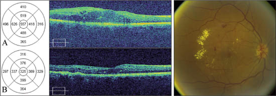 Figure 3. Sequential SD-OCT images from an 82-year-old female with diabetic macular edema in the right eye. Color fundus photograph shows exudates with macular thickening.