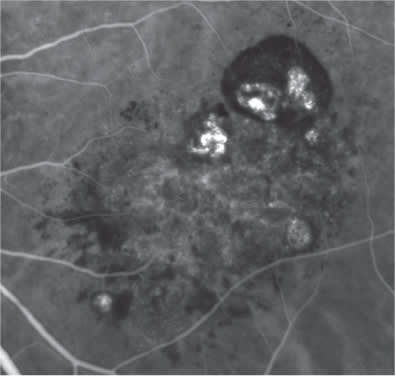 Indocyanine green angiogram demonstrates typical polypoidal lesions with branching vascular network at the macular area. IMAGE COURTESY OF TOMOHIRO IIDA, MD