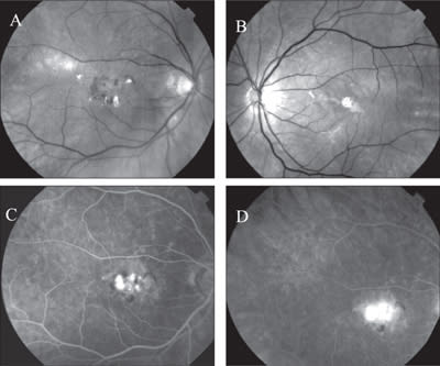 Figure 1. Red-free fundus photos of the right (A) and the left (B) eye in a patient with butterfly-shaped pattern dystrophy, complicated by a choroidal neovascular membrane in the right eye. Leaking CNV membrane is clearly demonstrated by FA (C and D).