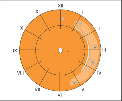 Figure 4. Further circumferential and posterior extension of the elevation 22 months after the initial exam. Three possible breaks are noted at 2.45, 3.45 and 5.15 o'clock. The macula is still intact and visual acuity was maintained at 20/20.