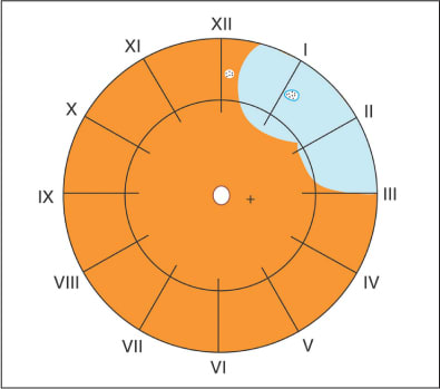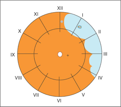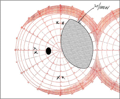 Figure 9. A visual field examination 12.5 years after surgery revealed an absolute scotoma consistent with the extent of the retinal elevation at the time of surgery.