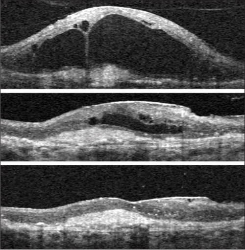 Figure 3. Exudative age-related macular degeneration with vitreomacular traction, surgical outcome (patient #4). Vertical spectral-domain optical coherence tomography scans through the center of the macula are shown. Top: Baseline scan shows vitreous adherent to the apex of large cavities within edematous retina, and an underlying choroidal neovascularization complex; this fluid persisted despite eight previous monthly injections of intravitreal bevacizumab. Middle: Image shows center of macula one month after vitrectomy with removal of the attached hyaloid membrane. Fluid is reabsorbing (note: the scale is adjusted to facilitate direct comparison with the other scans). Bottom (same magnification as top) six months follow-up: complete reabsorption of intra- and subretinal fluid. Monthly bevacizumab treatment was continued after surgery. Vision improved by one line, from 20/400 to 20/320.