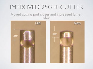 Figure 1. Compared with the 25-gauge cutter, the internal lumen and the port of the 25+ cutter are larger, and the port is closer to the tip.