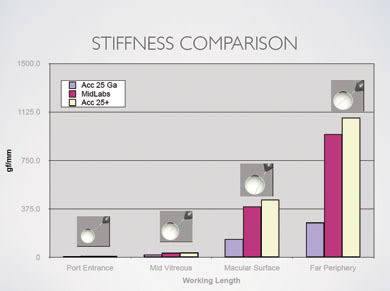 Another improvement with the 25+ cutter is that it is stiffer than the standard 25-gauge (Figure 3). That is critical for peripheral dissection. For a patient with thick adherent tissue, for example, I normally would do a horizontal scissors dissection, which is difficult in the far periphery of a detached retina. Instead, I can use proportional reflux to create a tissue separation and then use my small-gauge instrumentation to go behind the fibrous tissue and dissect. The tissue does not move, the retina does not move, and the retina does not incarcerate because I have superior fluidic stability.