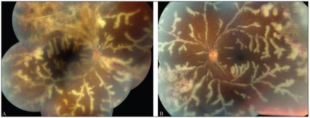 Figure 3. Fulminant CMV retinal necrosis and frosted branch angiitis in both eyes (A and B).