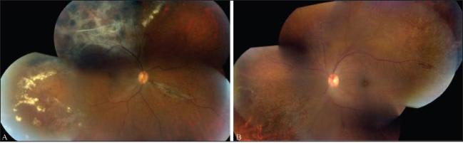 Figure 4. Regressed CMV retinitis with diffuse retinal atrophy and pigmentary changes superiorly and prominent intraretinal crystalline deposits temporally OD (A). Diffuse peripheral retinal atrophy with regressing perivascular disease in all four quadrants and regressing granular disease superotemporally and inferonasally OS. Mild vitritis is also present (B).
