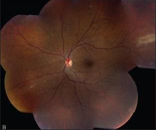 Figure 2. Progression of fulminant CMV retinitis to involve all four quadrants of the right eye with perivascular disease encroaching upon the fovea and optic nerve (A). Early temporal retinal necrosis of the left eye (B).