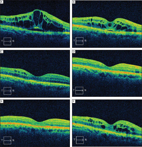 Case 3. A 42-year-old man with proliferative diabetic retinopathy OD and vitreous hemorrhage is status post vitrectomy, with recalcitrant macular edema and recurrent vitreous hemorrhages requiring bevacizumab injections as often as every three weeks to control his conditions. He has required 17 injections over the last 16 months. Figure A: His macular edema was 767 μm and his visual acuity was 20/70. Figure B: He received bevacizumab and his OCT decreased to 540 μm and his vision increased to 20/40-2. He then had an Ozurdex injection. Figure C: At his next visit, his OCT decreased to 251 μm and his vision remained stable at 20/40. Figures D-E: He stayed dry for two more months and his vision improved to 20/30. Figure F: Five months later, the patient started to reaccumulate fluid. OCT thickness increased to 383 μm and his vision decreased to 20/60.