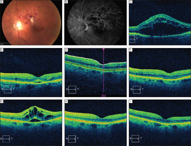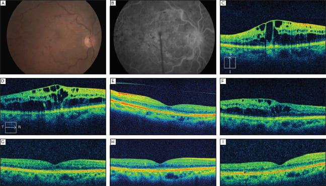 Case 1. Figures A-C: Fundus photo, FA and OCT of a 68-year-old woman with a CRVO OD and 20/60 vision, central field thickness is 670 μm. Figure D: She received bevacizumab injection and vision improved to 20/40, and the OCT thickness decreased to 449 μm. Figure E: The vision improved to 20/30 after Ozurdex injection and the OCT remained dry at 252 μm. Figure F: Four months from the original injection, the vision decreased to 20/70, and the OCT swelled to 433 μm. Figure G: The patient was switched to ranibizumab injection and OCT improved to 254 μm and the vision improved to 20/40. Figures H-I: Two weeks later, she received an Ozurdex injection, which caused the OCT to remain dry and the vision to stabilize at 20/30 for another three months (four months total).
