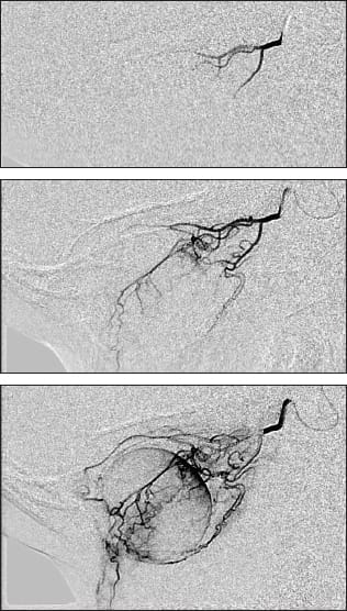 Figure 3. Superselective ophthalmic artery cannulation, followed by an angiogram showing vascular supply to the eye and focal delivery of chemotherapy.