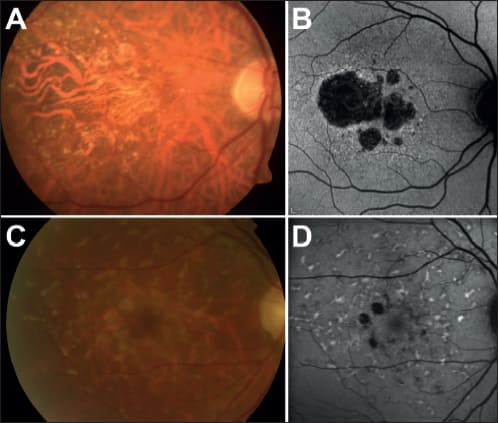 Figure 1. Geographic atrophy in AMD (A,B) and Stargardt's disease (C,D) are the targets for the first clinical trials of pluripotent, stem cell–based therapies in ophthalmology. (A,C: fundus color imaging; B,D: fundus autofluorescence cSLO imaging.)