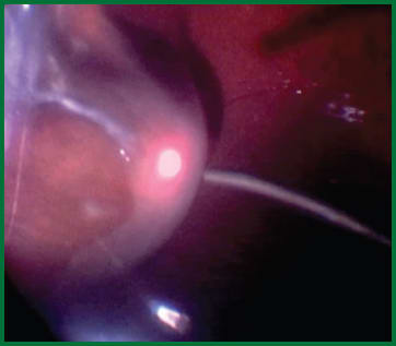 Figure 6. The CONSTELLATION® Vision System has an embedded 532-nm laser with a curved probe. Here the probe is used with chandelier illumination during scleral depression.