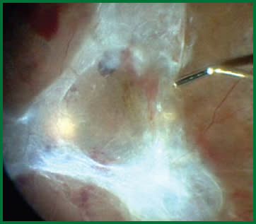 Figure 4. Reduced vascularity of abnormal tissue in an eye treated with an intravitreal injection of bevacizumab prior to vitrectomy for retinal detachment repair.