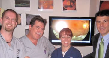 Michael Colucciello, MD, consults with a patient while retina staff look on. Staff members shown left to right are William Whitcraft, COA; Jennifer Morris, COA; and Michael Gulli. |