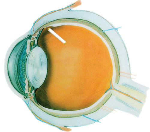 The implant is surgically inserted through the pars lana into the vitreous cavity, and a titanium loop is sutured to the sclera.5 It does not obstruct the visual axis but canbe seen at the slit-lamp with the pupil dilated. Fur ther, the implant can be re trieved from the eye at any time, providing an added level of safety (Figure 1c).