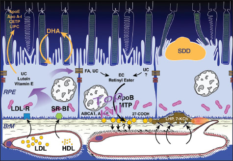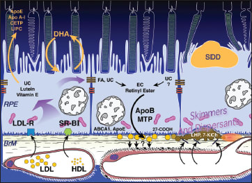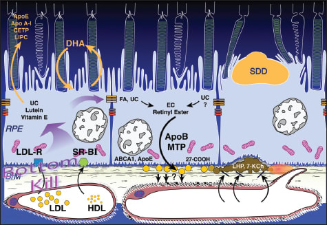 Dr. Curcio then turned to the biochemistry of these lipoprotein deposits. The source of the esterified cholesterol is apolipoprotein B-containing lipoproteins that are secreted by the RPE. The RPE expresses the abetalipoproteinemia gene, which is required for lipidating apolipoprotein B lipoproteins. Among other functions, RPE cell lines secrete apolipoprotein B and solid esterified cholesterol-rich particles in culture. The fatty acid profile of these lipoprotein deposits suggests that diet is the source of fatty acids, Dr. Curcio explained. They are high in linoleate, like plasma lipoproteins, and low in DHA, unlike the outer segments. The source of cholesterol is unknown, and although endogenous synthesis is possible, the most intriguing possibility is that it comes from outer segments. Dr. Curcio continued by explaining that this oil spill has functional con sequences, as esterified cholesterol is correlated with high hydraulic resistivity and poor transport across Bruch's membrane. Lipoprotein constituents interact with free radicals, generating pro-inflammatory and pro-angiogenic compounds. Further, biomechanically unstable BlinD is a cleavage plane for ingrowing neovessels.