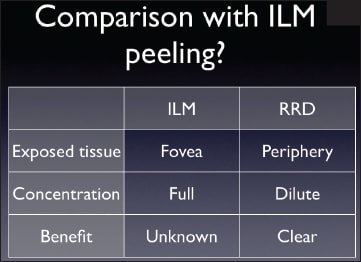 Here, Dr. Szurman transitioned to his second presentation, on new concepts in retinal reattachment surgery. One might assume, he said, that there might have been huge changes in this field. However, the basic principles remains unchanged: find the break, seal the break, and reattach the retina. Dr. Szurman undertook to discuss and explain what he identified as controversies in retinal reattachment surgery.