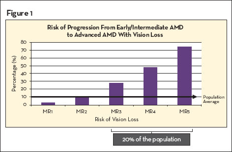 Risk levels 3, 4 and 5 represent 20% of individuals. The company asserts that those in the MR5 group have more than a 60% chance of progressing to advanced AMD with significant vision loss (Figure 1).