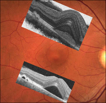 Figure 3. Central serous chorioretinopathy: clinical image with OCT macular cube and HD line overlays. Clinical image showing exudative foveal detachment and extrafoveal serous pigment epithelial detachments in the temporal macula.