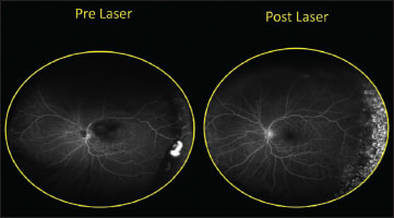 Dr. Freund showed pre- and post-treatment figures of both eyes (Figure 4) to demonstrate how he targeted only the ischemic areas with laser, avoiding the perfused areas. The neovascularization regressed in both eyes.