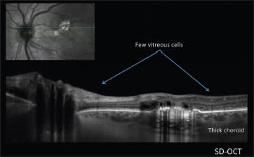 In the third OCT case, SD-OCT proved helpful in diagnosing a case of achromatopsia. In the fourth, an 87-year-old man who had undergone cataract surgery and was unhappy with the results. Fundus autofluorescence and SD-OCT were inconclusive. EDI-OCT enabled a diagnosis of age-related choroidal atrophy, a fairly common cause of vague visual complaints in the AMD population. The last OCT case was that of a 31-year-old woman with central scotomas diagnosed with acute macular neuroretinopathy.