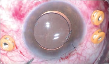 Figure 3. Note bag/bag placement of the IOL (preference for a three-piece acrylic IOL) and 10-0 nylon sutured, biplaned clear corneal wound.