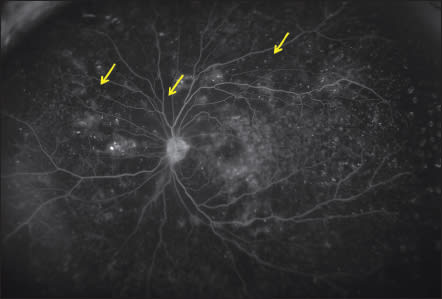Figure 1. Ultra-widefield fluorescein angiography of a patient with DME and areas of untreated midperipheral nonperfusion (arrows).