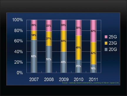 The common theory (or basic rule) regarding surgical wounds is that “much smaller is much better.” Actually, surgeons in Japan have been shifting dramatically from 20- to 23-g systems and from 23- to 25-g systems, along with the development of ergonomic instrumentation and new-generation vitrectomy machines over the years (Figure 1).11,12 According to a marketing survey by Alcon Japan, Ltd., more than 70% of the users of the Constellation Vision System (Alcon Laboratories, Inc., Fort Worth, TX) prefer 25-g systems for most cases.
