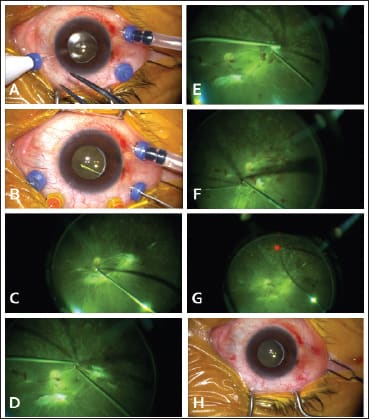 Figure 4. Twenty-seven–gauge vitrectomy for tractional retinal detachment Sequential procedures for combined surgery: A. A 27-g vitrectomy is ready immediately after the creation of 27-g sclerotomies by simple perpendicular incision with a 27-g trocar-cannula system through the pars plana. B. The vitrectomy machine used was the Accurus (Alcon Laboratories, Inc., Fort Worth, TX). The VGFI system estimated the optimal pressure at 30 mm Hg, which was used for 27-g vitrectomy with cutting rates ranging from 1,500 cpm to 2,500 cpm and an aspiration pressure of 600 mm Hg. C. The surgery was performed under chandelier illumination with wide-angle viewing and a magnified contact lens for macular work as necessary. Fibrovascular membranes were cut and removed using a 27-g high-speed vitrectomy cutter and a single hand, instead of vitreoretinal scissors. D. A bimanual technique using membrane forceps and a vitrectomy cutter was performed. Insertion of the blunt tip of the cutter into the spaces between the membranes and detached retina is much easier with the 27-g system than with 25- or 23-g cutters. E. In cases with strong membrane-retina adhesion, 27-g angled scissors are manufactured also for separation of the thickened fibrovascular membranes. F. Bimanual technique is also applied for hemostasis, applying diathermy in the left hand and a vitreous cutter in the right hand. The bleeding can be simultaneously aspirated and coagulated under chandelier illumination though wide-angle viewing. G. A 27-g curved endolaser probe is manufactured for panretinal photocoagulation in advanced PDR cases. H. At the end of surgery, after simple removal of all inserted instruments, the surgery was concluded without sutures.