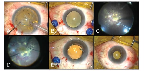 Figure 3. 27-g vitrectomy for diabetic macular edema. Sequential procedures for combined surgery: A. Phacoemulscification through a 2.2-mm clear corneal incision. B. Setting a standard three-port trocar-cannula system with a 27-g chandelier illumination for transconjunctival microincision vitrectomy surgery. C. Transconjunctival microincision vitrectomy for creating posterior vitreous separation. D. Brilliant blue G–assisted internal limiting membrane peeling. E. Posterior capsulotomy using a 27-g vitreous cutter following intraocular lens implantation through a corneal incision. F. Completing self-sealing of the super-otemporal corneal incision and three scleloromies.