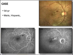 Dr. Freund showed a couple of examples next, beginning with a case of type 1 neovascularization in CSC masquerading as neovascular AMD (Figure 8), followed by a case of a myopic woman in whom a lesion was visible on OCT. In this case, while fluorescein angiography showed only occult CNV, indocyanine green angiography clarified that she had polyp (Figure 9).