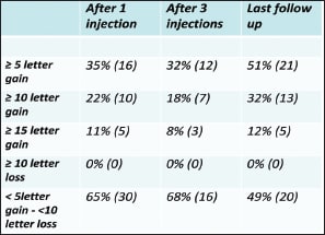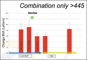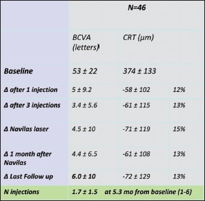 With most of the enrolled patients followed for four to six months, the average number of injections was 1.7 ±1.5 with an average improvement of 6.4 letters (Figures 21 and 22). Based on the central foveal thickness at baseline, 27 eyes received combination therapy (CRT at baseline ≥300 µm on Stratus OCT), and 19 eyes received focal/grid laser alone (CRT <300 pm at baseline). The combination group received three monthly injections of Avastin followed by Navilas laser treatment when CRT decreased to less than 300 µm. After, retreatment was based on worsening criteria, defined as a >20% increase in CRT and >6 letters dropped in BCVA, compared to the stabilized visual gain obtained after three anti-VEGF injections.