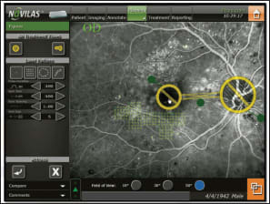 Software allows the surgeon to place yellow circles over the foveal avascular zone and the optic nerve area to avoid laser application to these regions (Figure 18). The surgeon can effectively plan a comprehensive treatment with the Navilas system, targeting all microaneurysms and nonperfused areas with the live imaging system.
