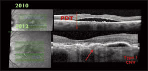 In a third example, a patient presented CSC associated with choroidal hyperpermeability. The following year, a thickened choroid and dilated choroidal vessels were evident, and the patient was treated for CSC. Dr. Freund treated the patient with photodynamic therapy. He indicated that his practice has seen some patients develop type 1 neovascularization after repeated PDT treatments. Two years after PDT, the patient had new-onset type 1 neovascularization (Figure 10). This case indicates for Dr. Freund that cases of CSC treated with PDT should be carefully monitored for neovascularization.
