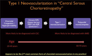 Dr. Freund referred to his own previous research, in which he and his coauthors found that PCV can masquerade as CSC. Today, it is clear that the opposite case is true: sub-RPE neovascularization in CSC can masquerade as PCV. Elaborating on this point, Dr. Freund turned to his current working thesis of neovascularization in macular disease (Figure 7). In his view, chronic RPE disease leads to type 1 neovascularization and, ultimately, to PCV. Such patients are more likely to be diagnosed with AMD than with CSC as they grow older. These cases are very common in his practice.