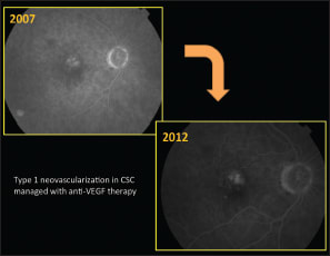 In the fourth example, a patient with a 40-year history of CSC developed type 1 neovascularization. Dr. Freund was able to show in this case that anti-VEGF therapy was effective (Figure 11) and that neovascularization developed in the fellow eye over five years of follow up (Figure 12). Three more cases of type 1 neovascularization in CSC masquerading as neovascular AMD were shown.